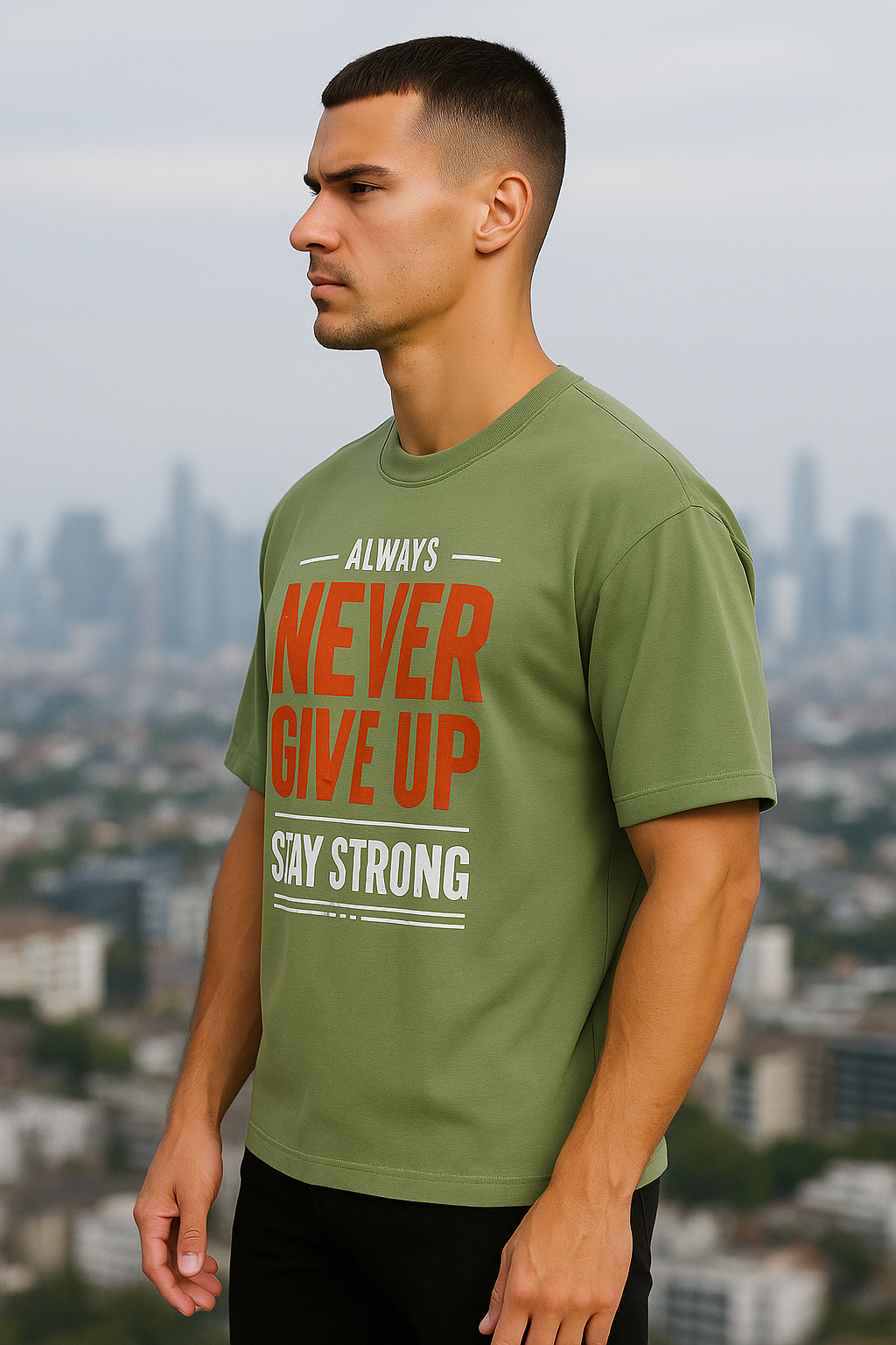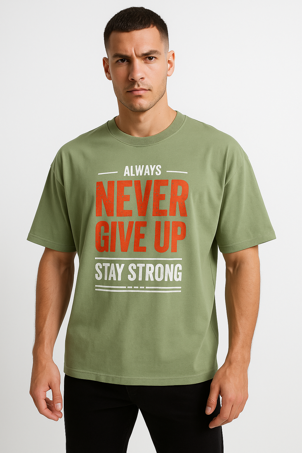 Be the first to review “Men round neck oversized cotton blend olive green DTF print t shirt.” Cancel reply