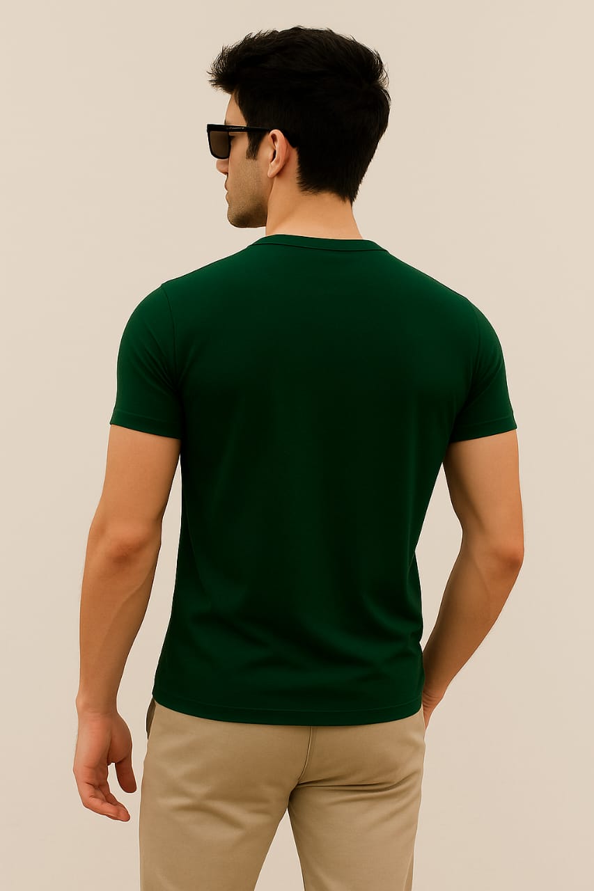 Men round neck regular fit 100% cotton bottle green t shirt.