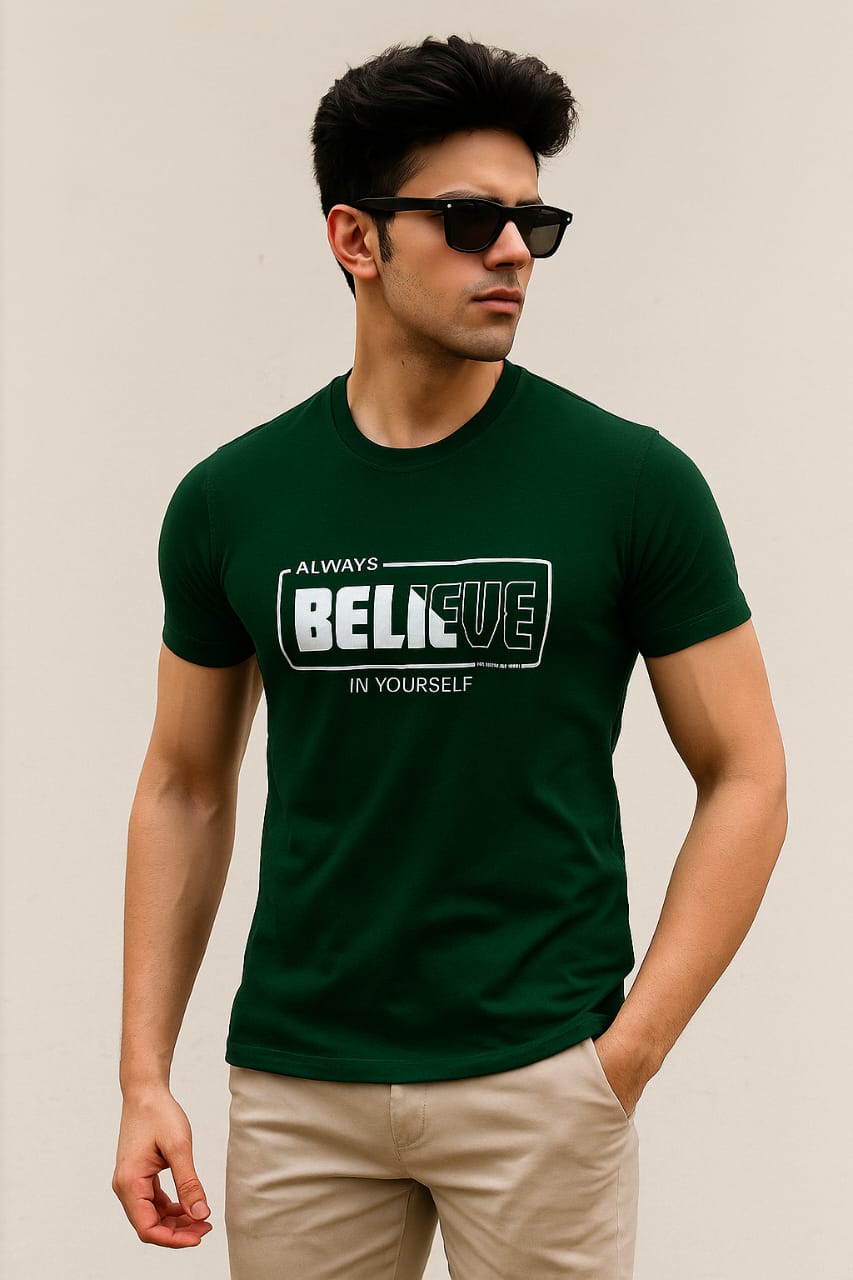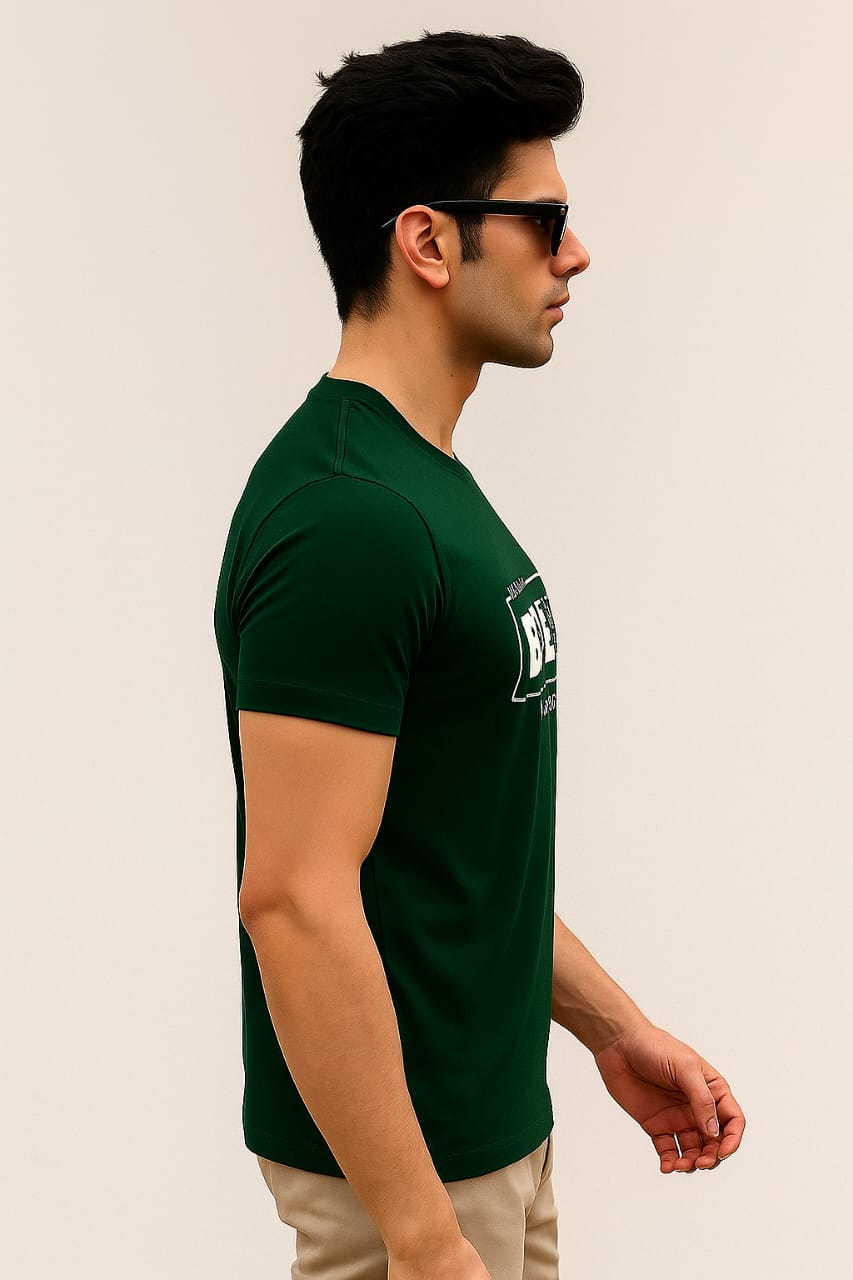 Men round neck regular fit 100% cotton bottle green front print t shirt.