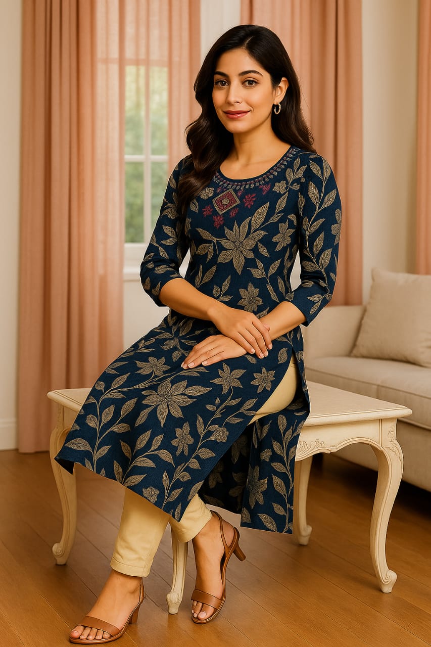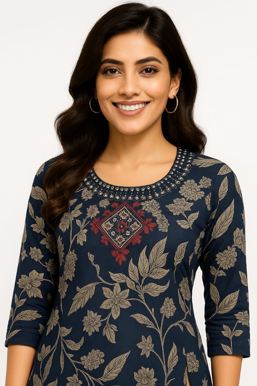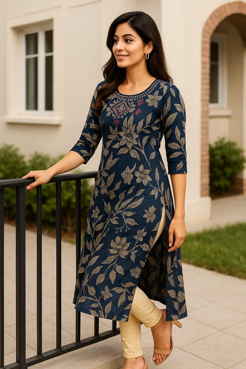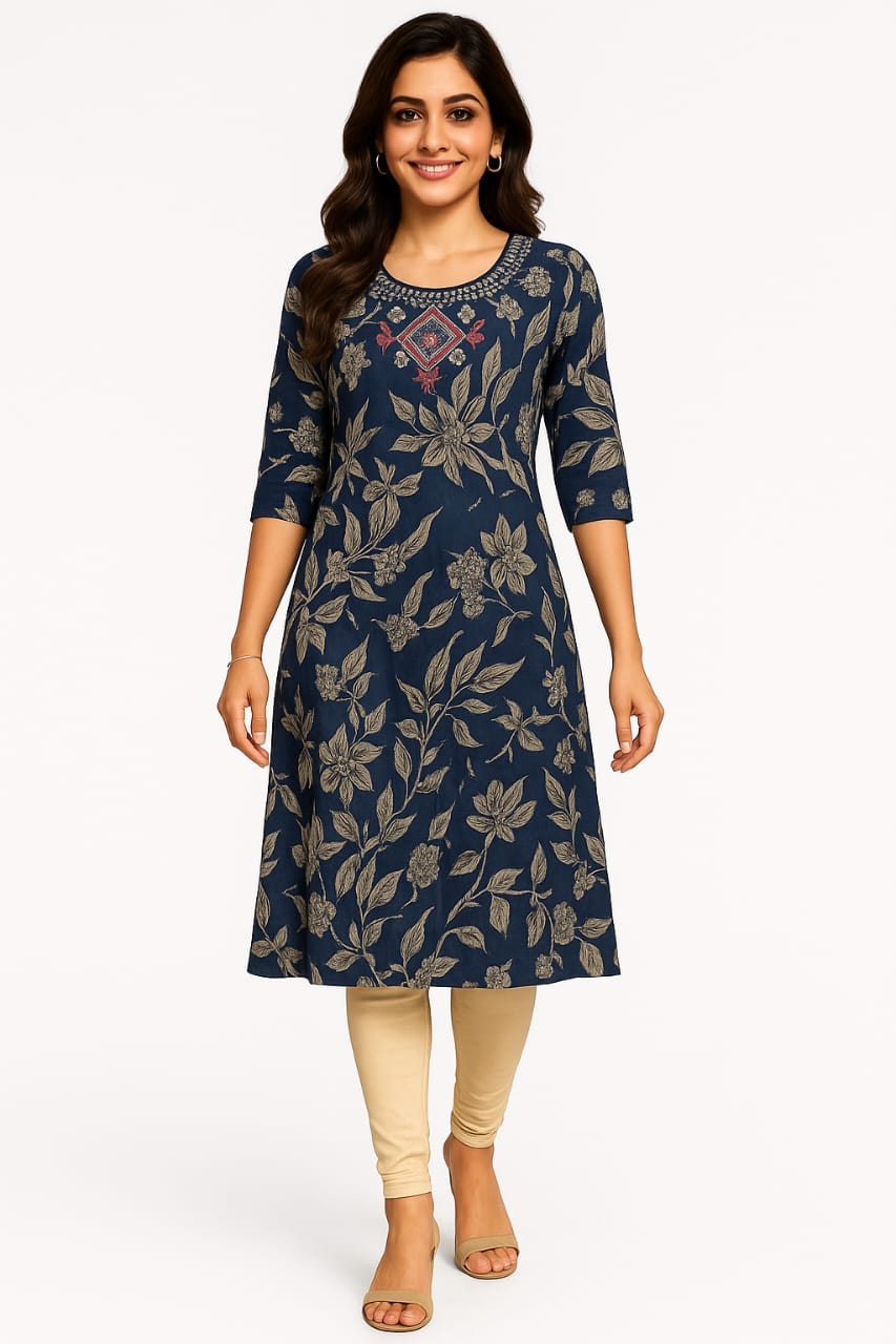 - Elegant Floral Print: Beautiful all-over beige floral print on a navy blue base for a stylish ethnic look.